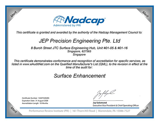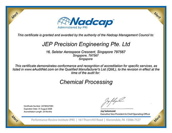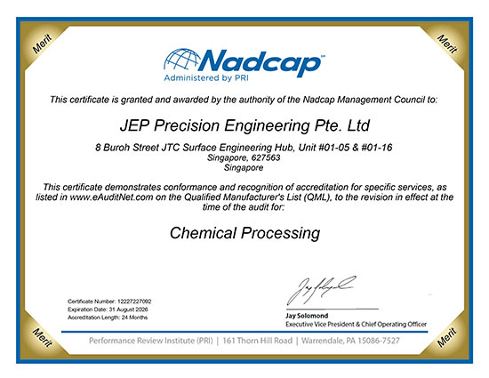 In addition to AS9100 and ISO 45001 accreditation to provide seamless manufacturing solutions to our customers, NADCAP accredited chemical processing and surface enhancement facility was set up at Tanjong Kling in 2014 for provision of secondary processes.